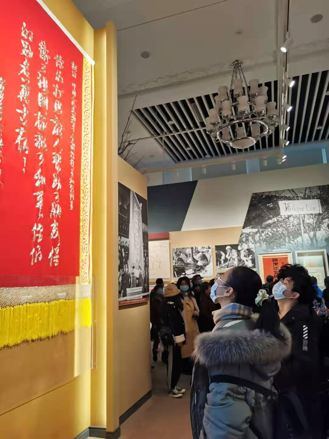 进入展区,首先映入眼帘的便是“铭记伟大胜利 捍卫和平正义”十个鎏金大字。漫步展厅,从决策出兵到五次战役,从停战谈判到胜利凯旋,各类视频、实物场景、旗帜徽章、油画雕塑、作战地图,仿佛把我们带回到七十年前那战火纷飞的日子。英雄人物展台前,同学们纷纷驻足停留。观看邱少云使用过的冲锋枪、黄继光使用过的水壶和挎包、牛保才使用的电话机和线拐子,战斗英雄们年轻青涩的面庞、英勇搏击的身影穿越历史的烽烟,清晰真切地展现在我们面前。其中824件首次展出的文物,展示了包括决策历程、联合国军细菌毒气战、全国抗美援朝活动等在内大众了解不多的历史事件,进一步加深了同学们对抗美援朝战争的认识和体会。