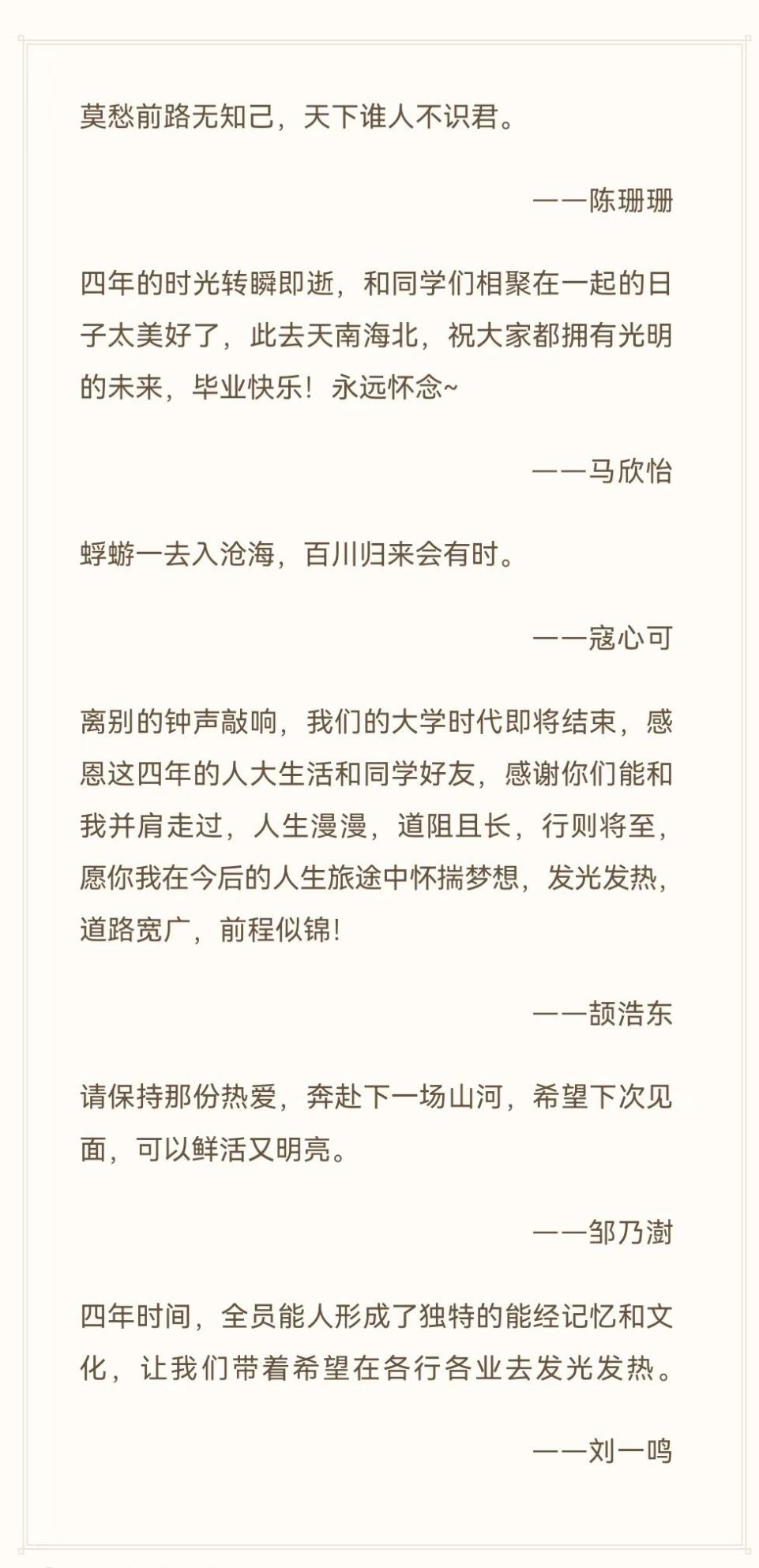 时光匆匆不待,前路尽已展开。回望四年前第一次迈入人大校门,那光景仿佛还眼前。记得第一次与舍友见面的笑容,记得第一次班会自我介绍的期待,记得第一次上课老师的开场白。四年的回忆有太多太多,出发前想用相机定格的场景似乎无处不在,要说再见的人还没离去就开始感慨。那就再看看校园吧,再去明德楼上一次自习,再去图书馆挑一本喜欢的书,去立德楼看一次日落,去东区食堂吃一次晚餐。收拾好行囊,带着四年的一切出发吧。前路鲜花盛开,彼方无尽光彩。
