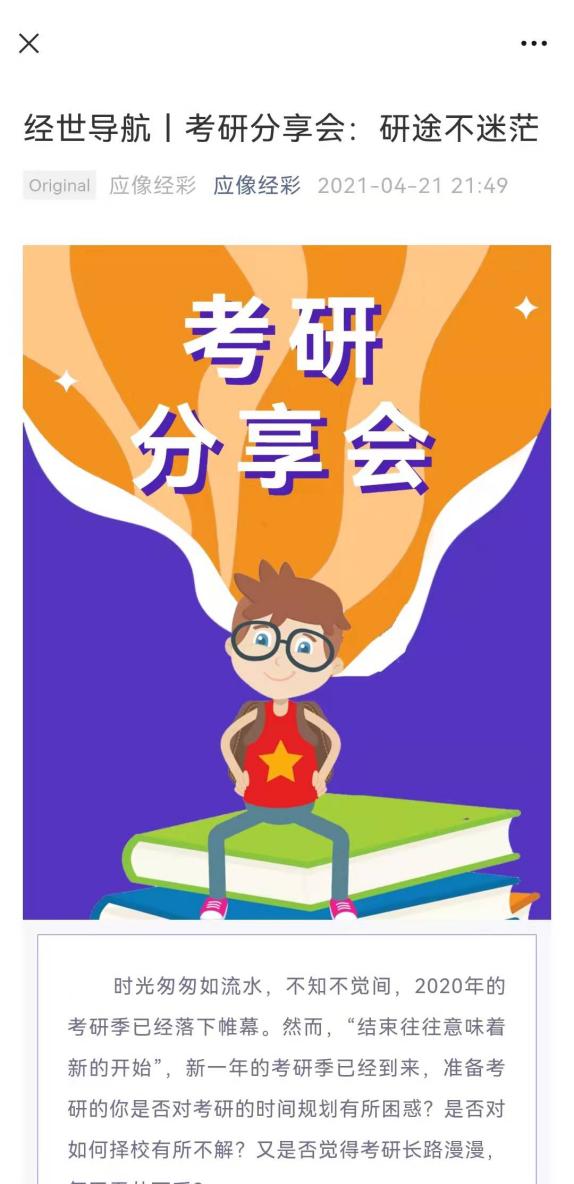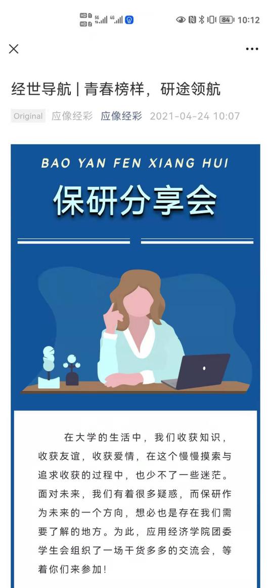 黑料社 学生会、研究生会充分发挥朋辈资源优势,组织开展了留学、大创、保研、考研、博资考、申请-考核等多次经验分享会、学术分享茶话会,邀请校友开展“经世导航”求职经验分享,推出应经学子成果展、求职就业信息系列推送,系列品牌活动覆盖了应经学子求学、求职之路的各个方面。全方位服务学生发展,充分发挥黑料社 引领、学长“传帮带”作用,多角度提升学术专业本领。