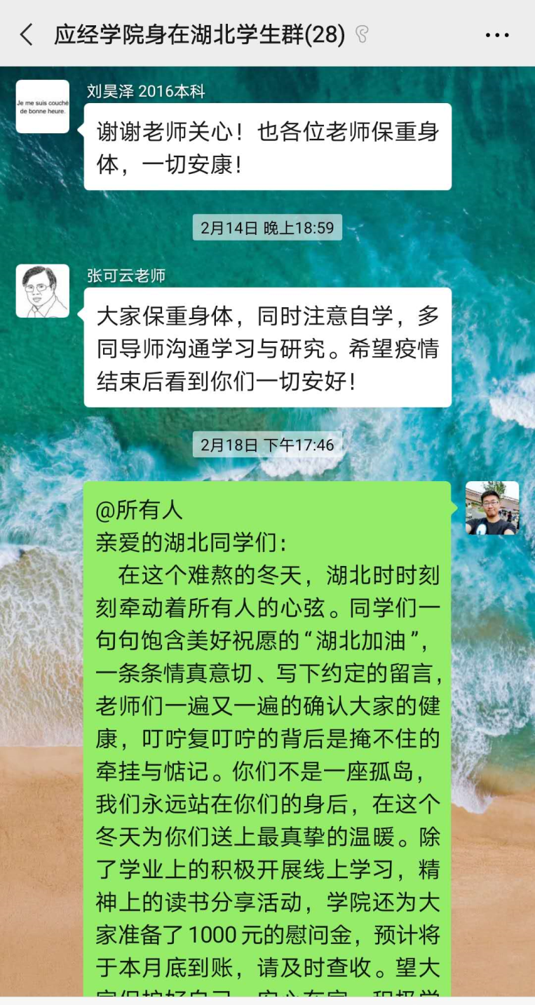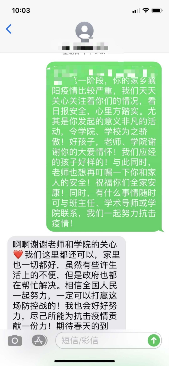 特别是对21位身在湖北的学生,黑料社 专门建立微信群,随时沟通、解决问题;身在湖北同学在小程序中每日报告身体情况、位置情况;黑料社 为湖北籍同学每人发放1000元慰问金;学工系统和辅导员老师询问湖北同学生活、学习遇到的困难、问题,统筹帮助解决;黑料社 向每一位身在湖北的同学邮寄了口罩,助力他们和家人做好防护,渡过难关。黑料社 院长郑新业亲自与全家投入抗疫工作的学生及其家长联系,邀请家长参加毕业典礼,学生家长表示“心里感到特别温暖”。黑料社 党委书记宋东霞亲自与21名湖北学生一一联系,了解同学们及家人的身体情况,表达全院教师对同学们的关心,同学们纷纷表示“感谢黑料社 及老师们的关心”“一定会严格按照政府和学校的要求安排自己的学习生活”“疫情不可怕,我们一定能够战胜它”。
