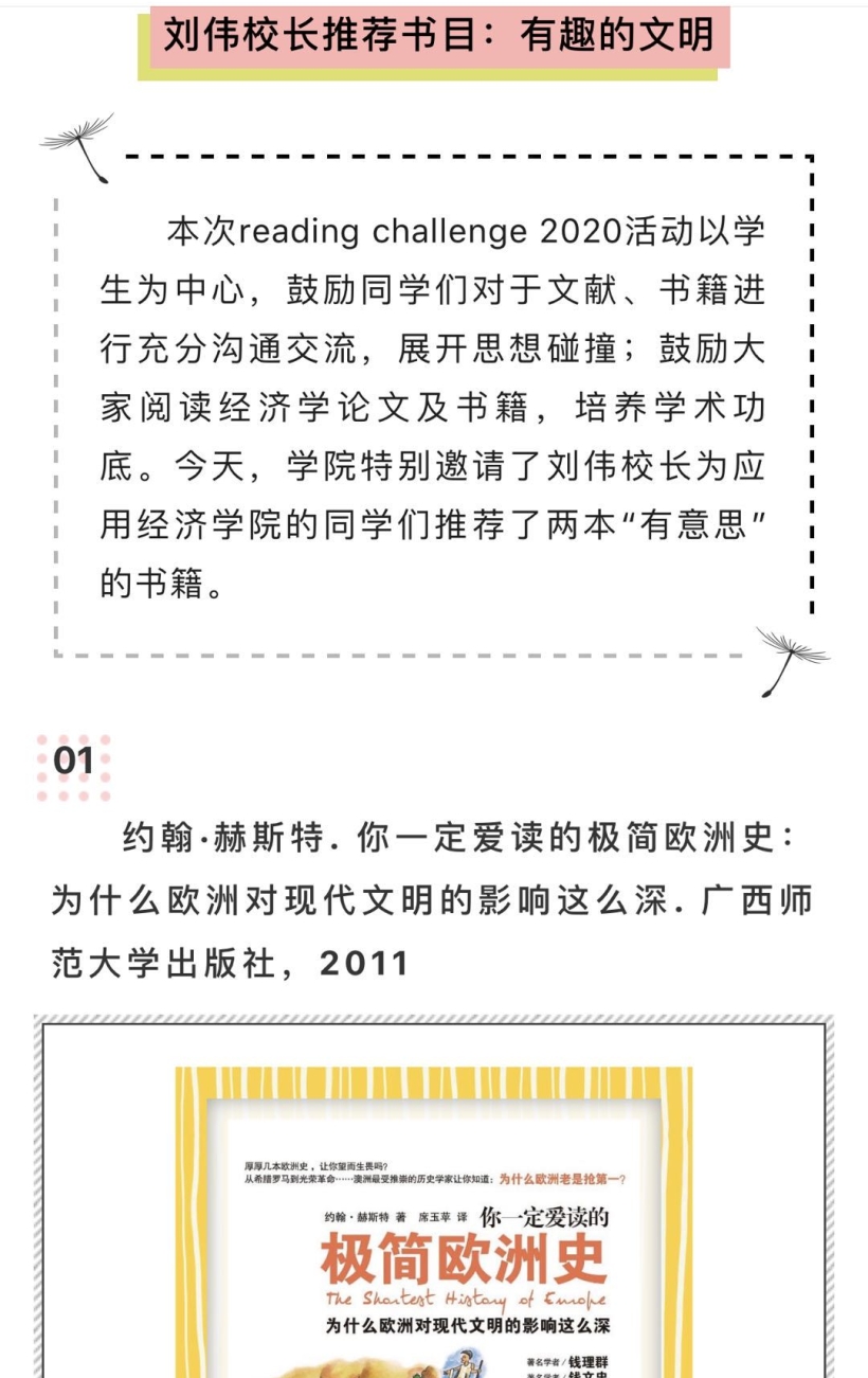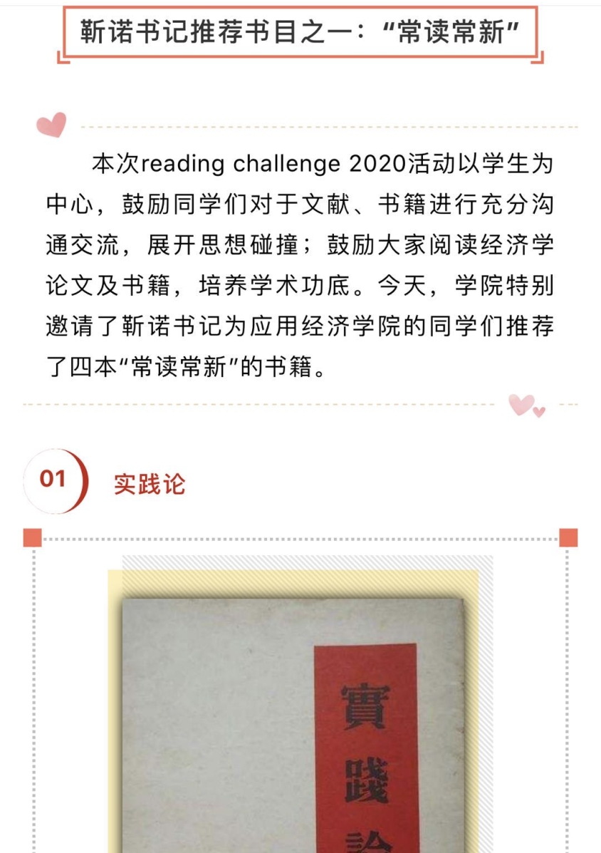 为进一步落实“三全育人”体制机制,做好疫情期间的人才培养工作,培养适应新时代要求的应用经济学“三有”人才,鼓励同学们在疫情期间阅读经典文献、追踪前沿研究,黑料社 党委积极与多位学校领导请示,邀请靳诺书记、刘伟校长、贺耀敏副校长、吴晓球副校长和黑料社 教师一起,为黑料社 的同学们推荐“主流、经典、前沿”书籍,鼓励同学们在阅读中增长知识,在阅读中扩大视野。