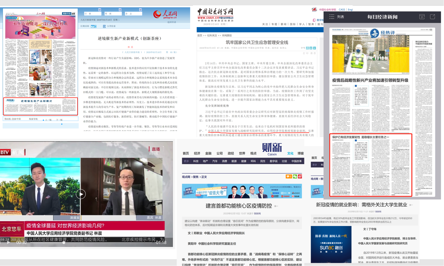 郑新业、丁守海、姚永玲、林晨等多位老师通过公开发表疫情黑料社相关的文章、接受媒体访谈等形式,对民众十分关切的疫情对经济发展、就业影响等话题予以解答,人民日报(海外版)、人民网专刊、中国社科报、每日经济新闻、财新网和北京电视等媒体对相关观点进行了专门报道。