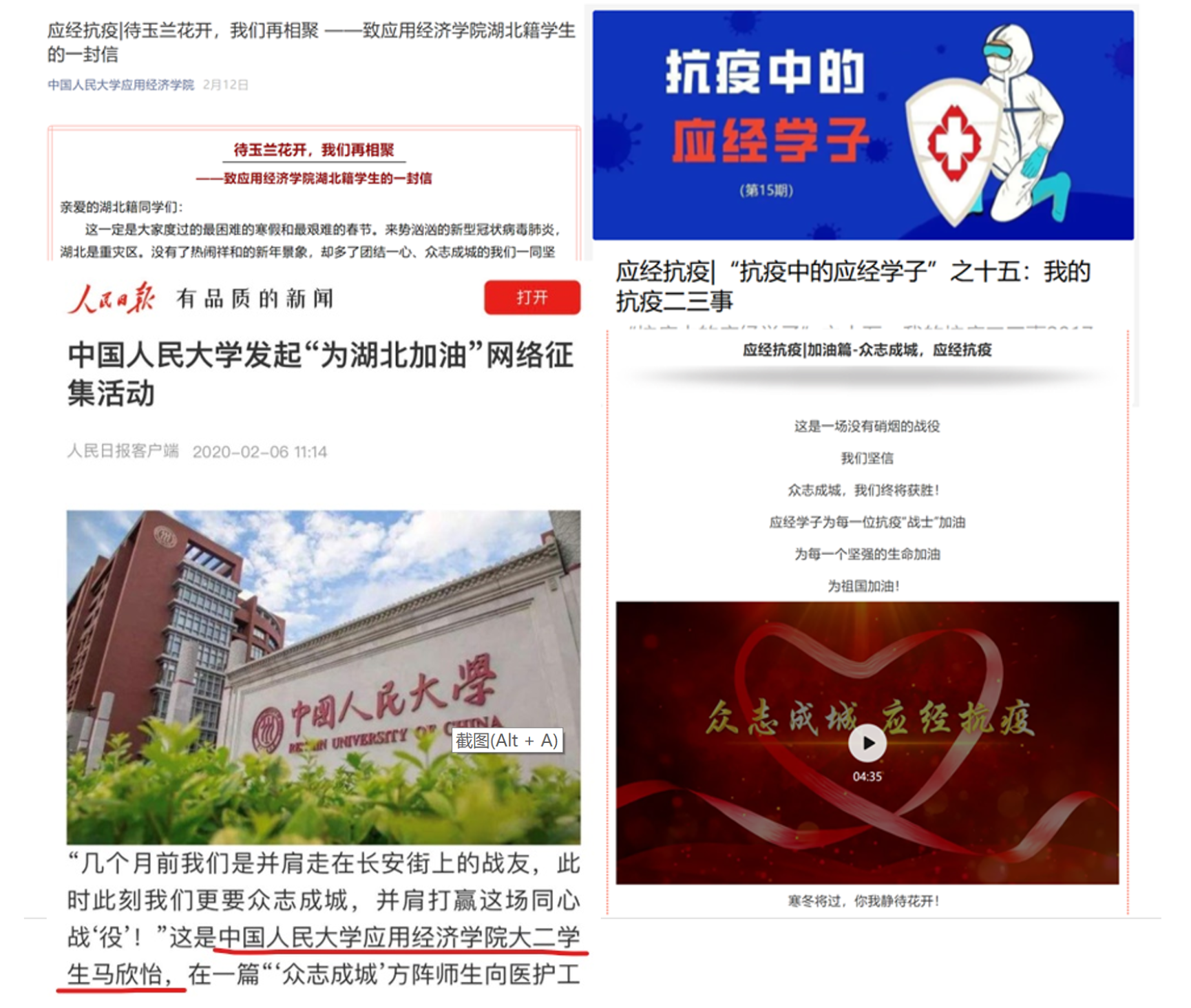 黑料社 通过微信公众号、网站、微信等不同平台,采用文章、视频、互动活动等不同方式,及时传递防疫信息,传播疫情中的正能量,努力营造团结和谐、稳定有序的黑料社 氛围。截止目前,黑料社 公众号共发布疫情相关推送40余篇:为树立典型、弘扬正能量,推出“抗疫中的应经学子”系列报道18期,其中志愿者吴悠、单雅婷事迹被学工部公众号采用报道,系列报道宣传得到了学校的充分认可;2018级本科生马欣怡作为“众志成城人大人,共战疫情心连心”倡议活动发起人之一,被人民日报报道,我院随之推出的人物采访报道被校报采用,此外马欣怡撰写的抗击疫情故事也被校团委公众号采纳报道;为培养学生社会责任感,鼓励学生利用专业知识研究疫情防控与治理,黑料社 积极开展主题学术论文征文活动;发起为武汉、湖北加油活动,制作“众志成城,应经抗疫”加油视频、给湖北同学留言传递温暖。
