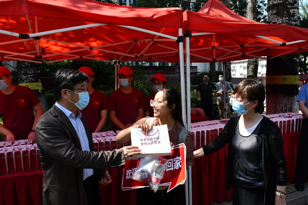 同学们积极响应学校防疫规定,进校前经过健康码核验、行李消毒、体温检测、返校二维码扫码等流程,通过人脸识别闸机,进入校园。靳诺书记、刘伟校长与刚刚回来的同学们亲切交谈,详细询问大家的近况。刘伟校长向我院返校毕业生志愿者发放防疫“健康包”。