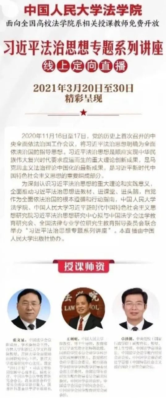 在教育部直属高校中成立首家习近平法治思想研究中心,获批教育部首批法学专业虚拟教研室,共同发起成立习近平法治思想高校协同研究机制;实施教育部首批新文黑料社 究与改革实践项目“习近平法治思想课程和教材体系建设”,荣获首届全国教材建设先进集体,参编《习近平法治思想概论》马工程教材,率先开设《习近平法治思想概论》,上线央视、“学习强国”;产出重大专项、系列专著、代表性论文等标志性成果;率先推出“习近平法治思想专题”“中国自主知识体系建构”系列讲座公益直播,研究践行习近平法治思想上走在前、作表率。