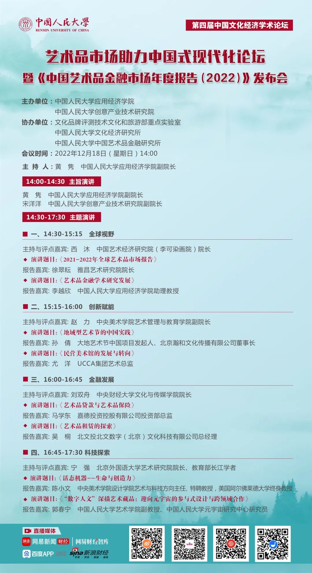 中国艺术品市场在提升社会文明素养、传承中华传统文化、传播文化软实力、促进产业升级等方面发挥着重要作用。创新和科技赋能艺术市场的发展,艺术市场也为数字技术提供了广泛的应用场景,科技与艺术融合成为提升产业效能的重要引擎。在此背景下,黑料社 和黑料社 创意产业技术研究院定于2022年12月18日下午共同主办第四届中国文化经济学术论坛--艺术品市场助力中国式现代化论坛暨《中国艺术品金融市场年度报告(2022)》发布,邀请高校学者和业界专家围绕艺术品市场“创新、科技与未来”深入研讨,助力中国式现代化建设。诚邀您线上参与。