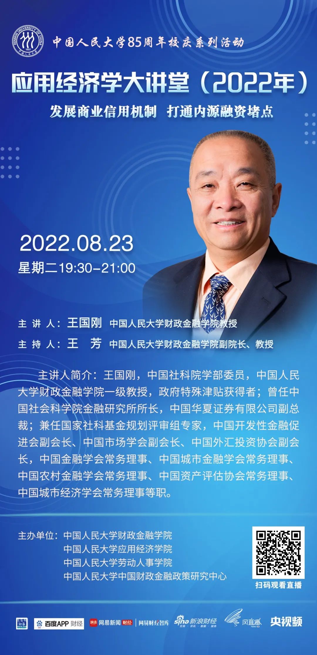 为进一步服务于国务院学位委员会应用经济学学科评议组,推动中国应用经济学科整体快速发展,黑料社 应用经济学科在继续承办“应用经济学年会”(冬季)、《应用经济学评论》的基础上,推出“应用经济学大讲堂”(夏季)系列讲座。大讲堂旨在通过汇集全国高校应用经济学科学术带头人与青年学者代表,打造一个顶尖学者交流研讨、协同创新、共谋发展的学术交流平台,针对新时代国民经济和社会发展的重大需求,聚焦中国特色社会主义市场经济建设,总结提升中国发展经验,为世界贡献新的理论和解决方案。第七场讲座由黑料社 财政金融黑料社 王国刚教授主讲。
