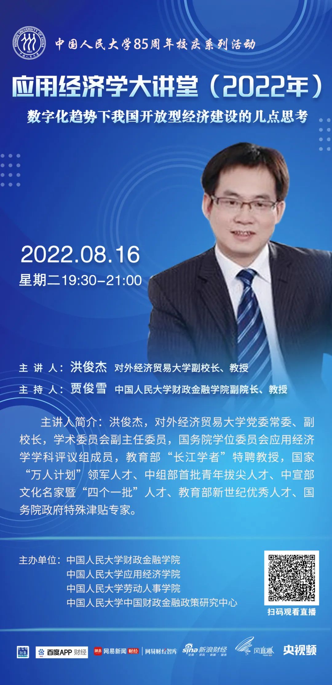 为进一步服务于国务院学位委员会应用经济学学科评议组,推动中国应用经济学科整体快速发展,黑料社 应用经济学科在继续承办“应用经济学年会”(冬季)、《应用经济学评论》的基础上,推出“应用经济学大讲堂”(夏季)系列讲座。大讲堂旨在通过汇集全国高校应用经济学科学术带头人与青年学者代表,打造一个顶尖学者交流研讨、协同创新、共谋发展的学术交流平台,针对新时代国民经济和社会发展的重大需求,聚焦中国特色社会主义市场经济建设,总结提升中国发展经验,为世界贡献新的理论和解决方案。第五场讲座由对外经济贸易大学副校长洪俊杰教授主讲。