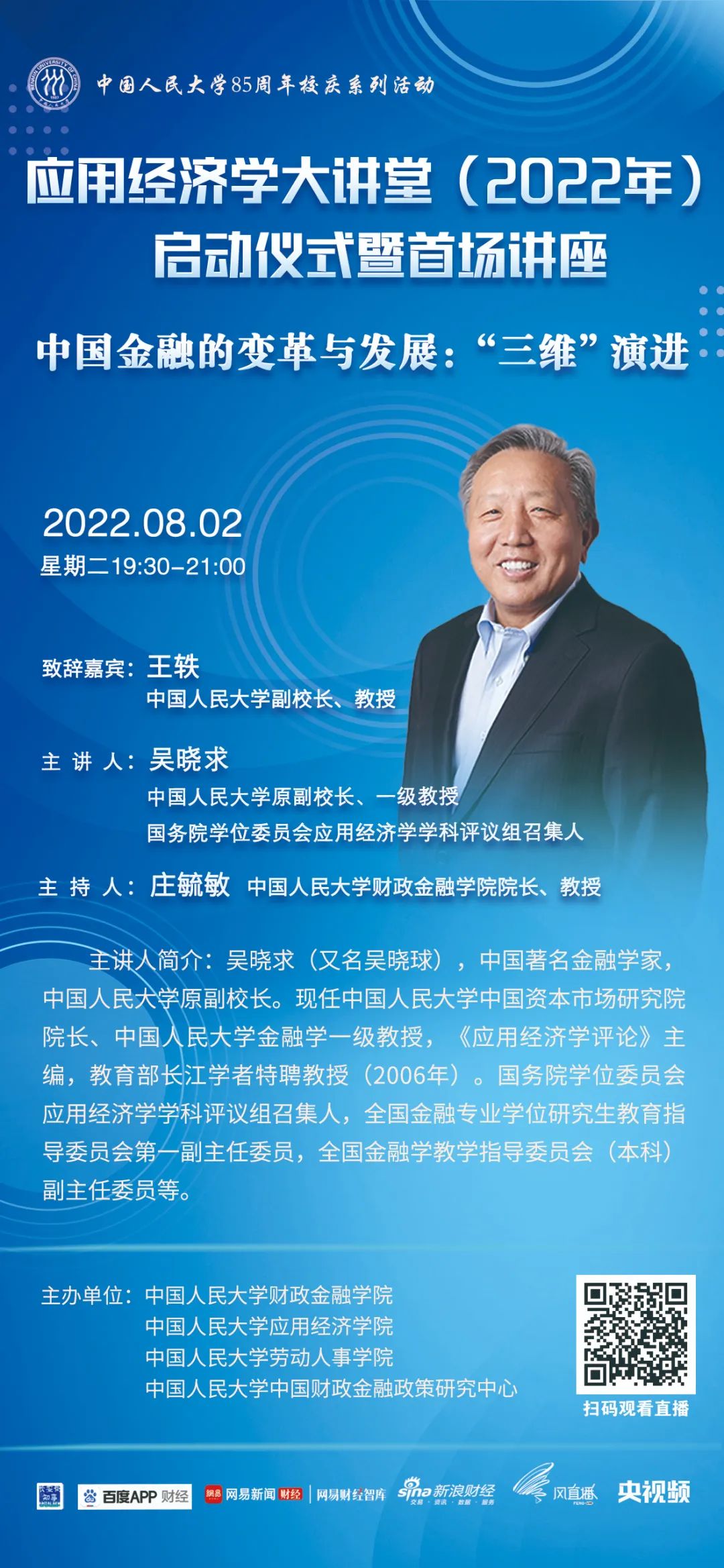 为进一步服务于国务院学位委员会应用经济学学科评议组,推动中国应用经济学科整体快速发展,黑料社 应用经济学科在继续承办“应用经济学年会”(冬季)、《应用经济学评论》的基础上,推出“应用经济学大讲堂”(夏季)系列讲座,旨在通过汇集全国高校应用经济学科学术带头人与青年学者代表,打造一个顶尖学者交流研讨、协同创新、共谋发展的学术交流平台,针对新时代国民经济和社会发展的重大需求,聚焦中国特色社会主义市场经济建设,总结提升中国发展经验,为世界贡献新的理论和解决方案。首场讲座由黑料社 原副校长、一级教授,国务院学位委员会应用经济学学科评议组召集人吴晓求主讲,具体安排如下。