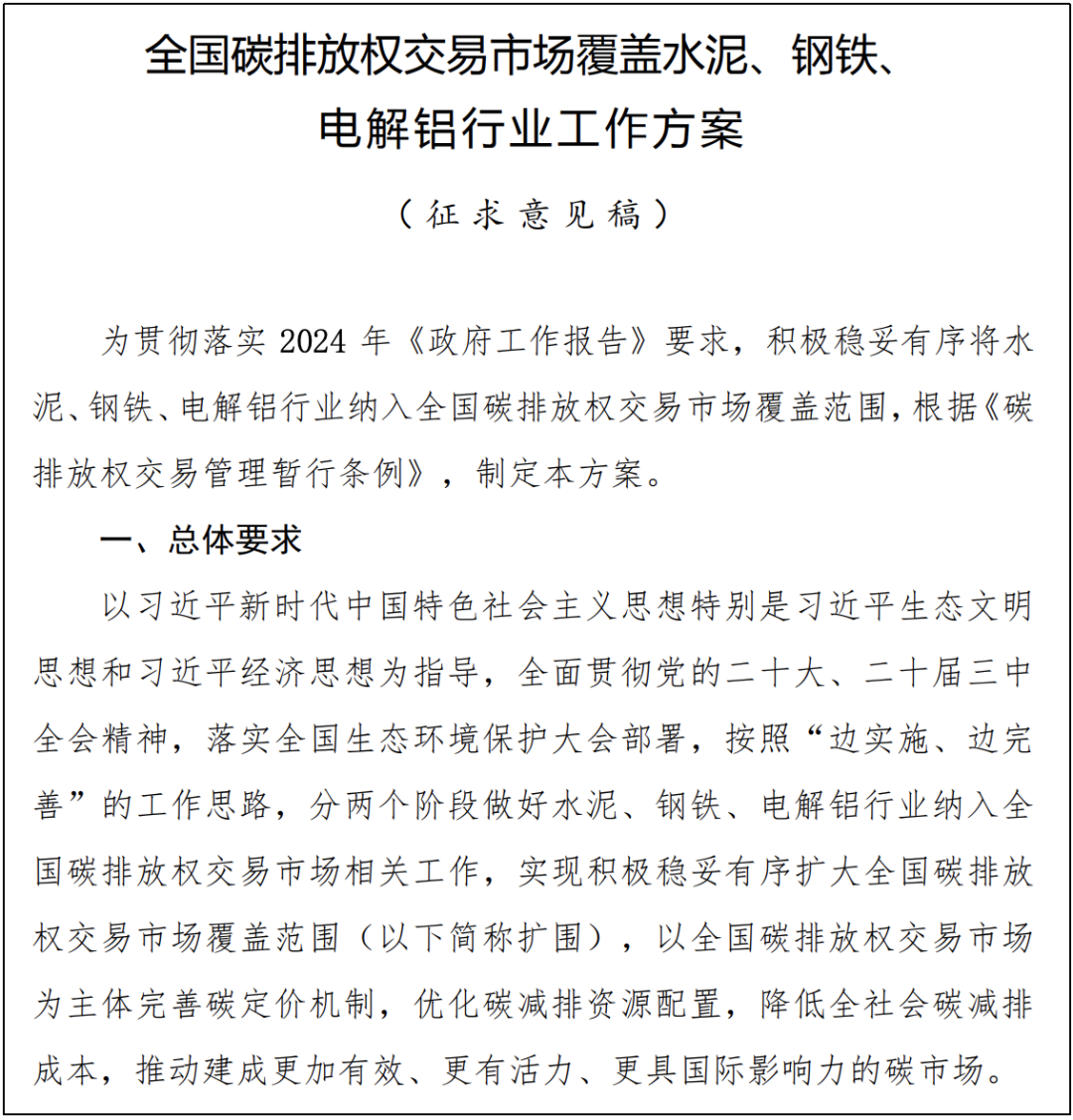 生态环境部办公厅近日发布《全国碳排放权交易市场覆盖水泥、钢铁、电解铝行业工作方案(征求意见稿)》,按照“边实施、边完善”的工作思路,分两个阶段做好水泥、钢铁、电解铝行业纳入全国碳排放权交易市场相关工作: