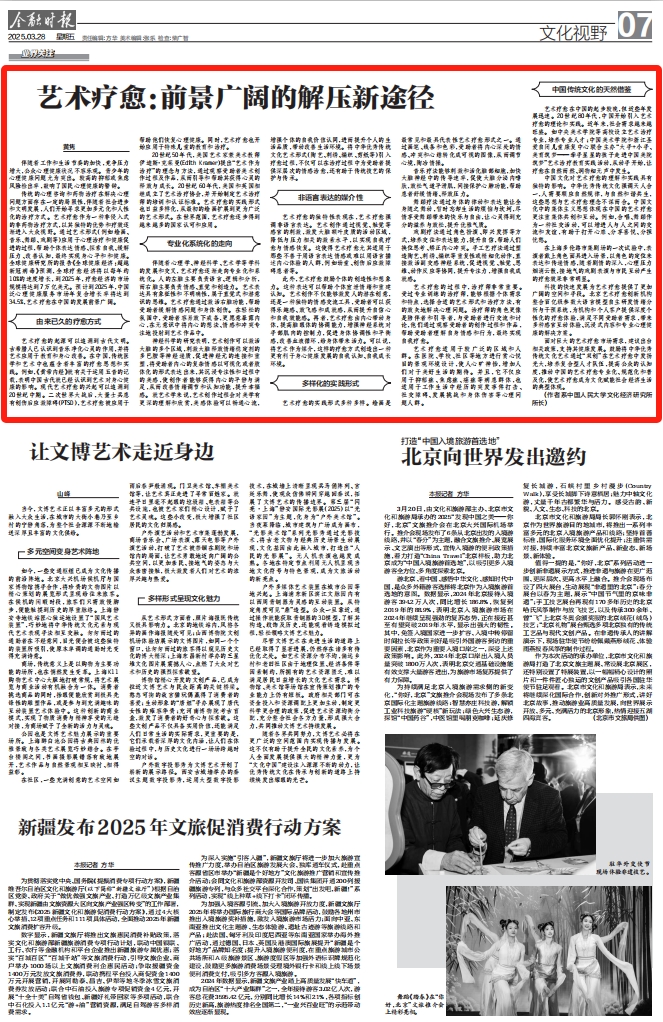 面对巨大的艺术疗愈市场需求,建议出台相关政策,支持其健康发展。鼓励将中华优秀传统文化艺术通过“双创”在艺术疗愈中发扬光大,培养复合型人才队伍,提高公众的认知度,推动中国的艺术疗愈专业化、规范化和普及化,使艺术疗愈成为文化赋能社会经济生活的典型体现。