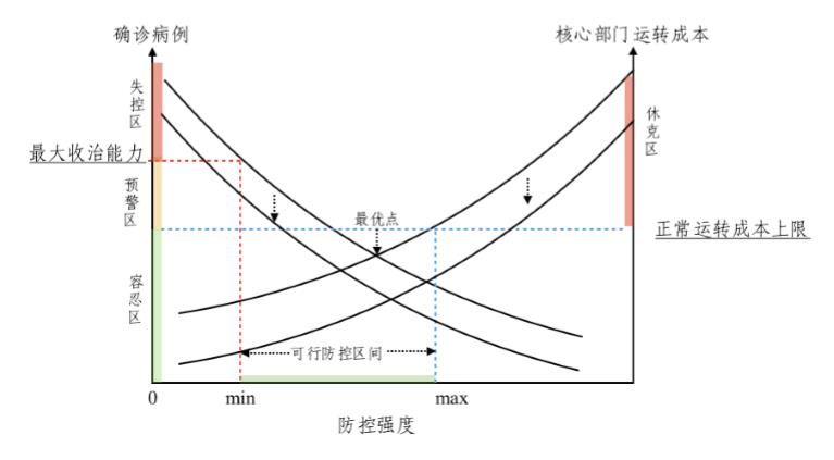 可行的解决思路,是合理设置疫情容忍区间和防控强度的上下限,进而梳理和制定疫情防控体系(见附件二)。一是根据本地最大收治能力(依据病床数、医疗团队、检测试剂盒等)设定“最小”防控强度,确保区域内所有病例能够及时得到诊治而不沦为“失控区”。二是根据核心中央单位正常运转所能承受的最大防控成本,设定最大防控强度,确保中央单位不会因过强的防控而进入“休克区”。根据疫情“失控区”和单位“休克区”确定首都功能核心区防控强度的上下限,能够兼顾两个“确保”。