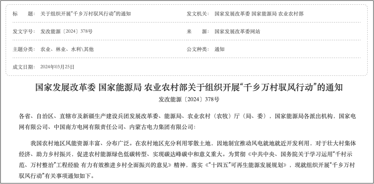 近日,国家发展和改革委员会等部门发布了关于组织开展“千乡万村驭风行动”的通知,提出在具备条件的县市区及其他农村地区,以村为单位建成一批就地就近开发利用的风电项目。通知明确,每个行政村原则上不超过20兆瓦,同时探索形成村企合作的风电投资建设新模式和共建共享的收益分配新机制,推动构建村里有风电、集体增收益、村民得实惠的风电开发利用新格局。