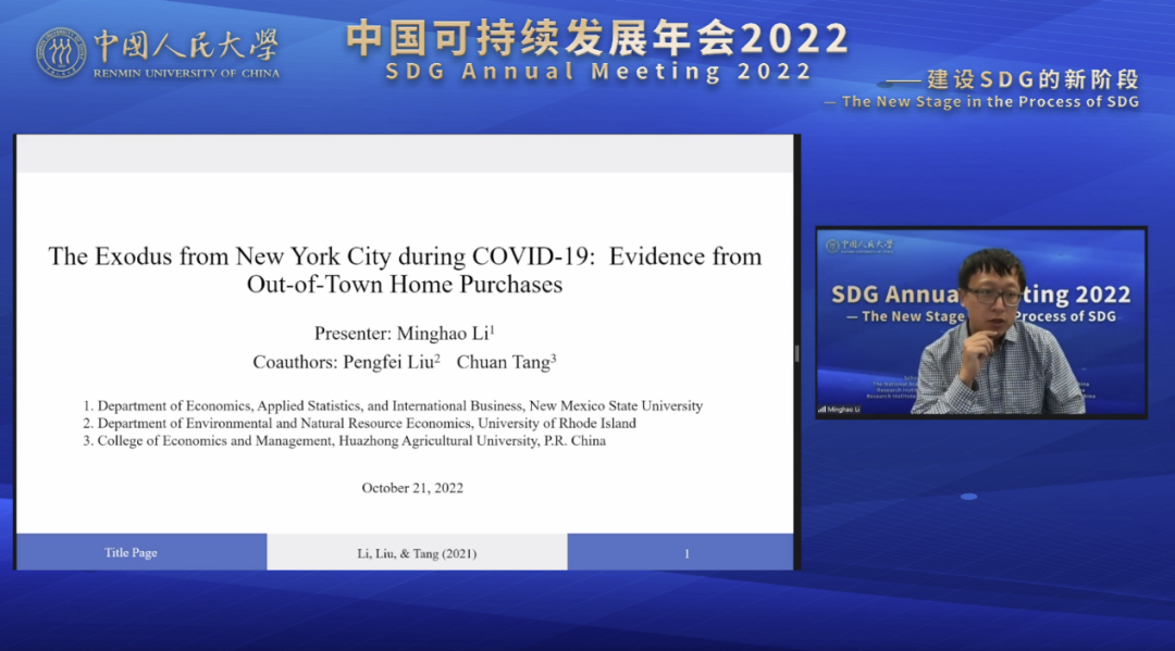 新墨西哥州立大学助理教授李明昊作报告,题目为“The Exodus from New York City during COVID-19: Evidence from Out-of-Town Home Purchases”。 报告使用纽约市及周边数以百万计的房地产交易数据,为2019新型冠状病毒爆发后人口从大都市向周边地区外流提供了直接证据。在新冠疫情流行的最高点,纽约市购房者在周边地区的房产购买量较疫情前增长了180%。就影响因素而言,自然便利设施和互联网接入的吸引力增强,而城市便利设施的吸引力下降。