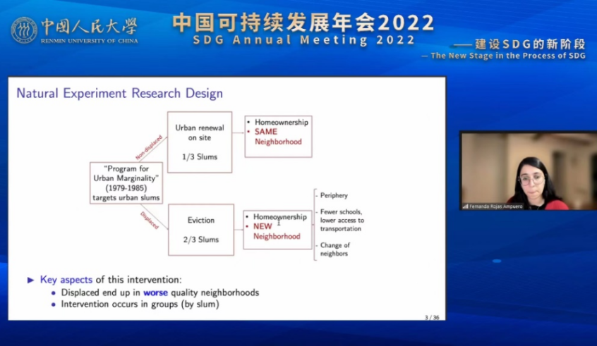 哈佛大学的博士后Fernanda Rojas-Ampuero作报告,题目为“Sent Away: The Long-Term Effects of Slum Clearance on Children”。报告聚焦智利在1979-1985年的贫民窟安置计划。该计划使得一部分贫民窟居民被迫搬迁到位于城市边缘的贫困地区,另一些则在原来地点新建住房。通过追踪并比较搬迁与未搬迁家庭的儿童在四十年后的收入和教育情况,该研究发现,搬迁家庭的儿童成年后的收入和教育水平均低于未搬迁家庭的儿童。该研究进而从安置地的环境条件对搬迁的负向影响做出解释,包括安置地的学校数量更少、社区更加分散程度、距离地铁更远等因素。