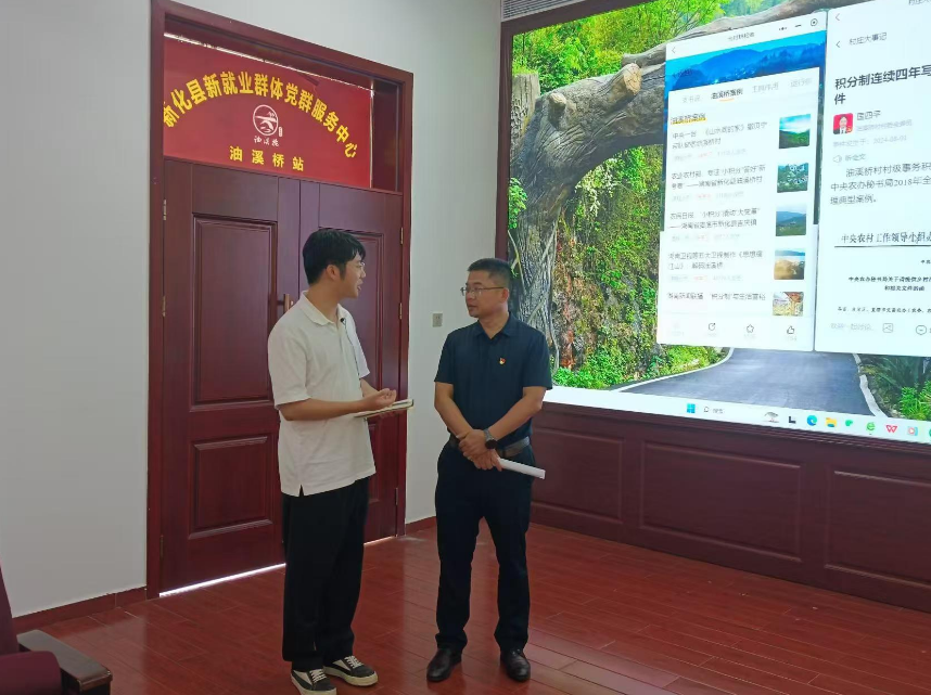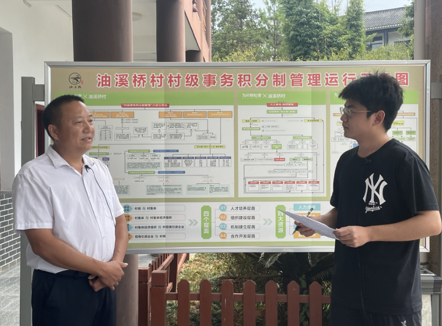 ▲博士生谢岳峰访谈油溪桥村党支部书记彭育晚