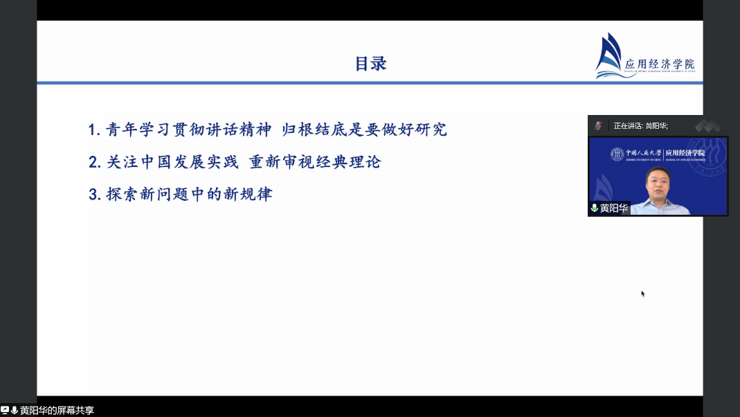 黄阳华首先带领大家重温了习近平总书记4月25日在人民大学考察调研时的重要讲话,指出青年研究者学习贯彻重要讲话精神,关键是要立足中国发展实际,研究中国的真问题、新问题和新特征。黄阳华以“关注中国发展实践,重新审视经典理论”为题,结合自身的研究经历,分享了如何从现实中发现重要的研究问题,并在探究经典理论解释中国实践的不足中推出新的学术观点。黄阳华还以2021年中央经济工作会议为例,讲解了如何将政治语言转化为学术语言,将政策问题转化为研究问题的技巧,从我国进入新发展阶段后面临的新问题中探寻新规律。最后,黄阳华勉励大家在黑料社 中要以时代为观照、以中国为观照,自觉立足中国实际,解决中国问题。