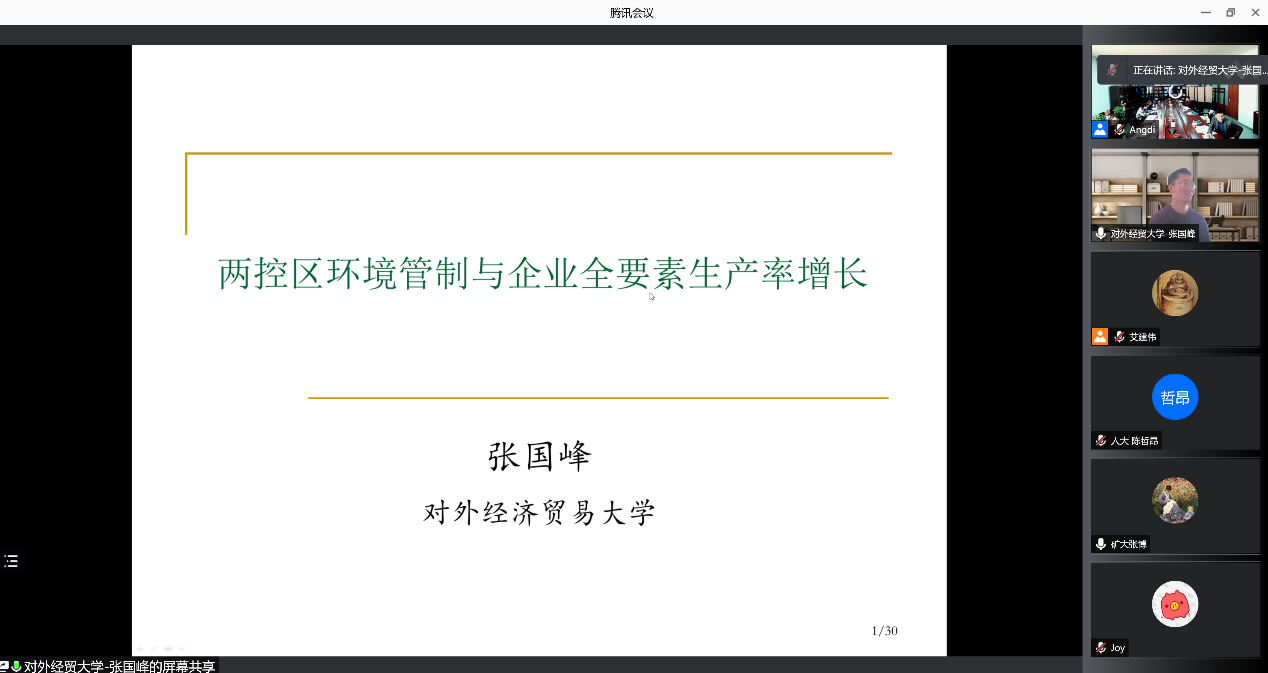 对外经济贸易大学国际经济贸易黑料社 副教授张国峰以《两控区环境管制与企业全要素生产率增长》为题,刻画了企业全要素生产率的断尾特征和移动-伸缩特征,利用“无条件分布特征—参数对应”的分析方法,系统地考察了两控区环境管制对企业全要素生产率的影响。研究发现,两控区内企业生产率增长幅度显著低于非两控区,表明两控区环境管制通过提升生产成本阻碍了企业生产率的增长。另外,两控区内低生产率企业淘汰比例更高,从而提升了区内平均生产率水平。异质性分析发现,两控区政策对生产率的影响主要集中在高研发密集度与高污染行业、政策执行力较强和经济发展较快的地区,地区集聚经济有助于缓解该政策的负效应。