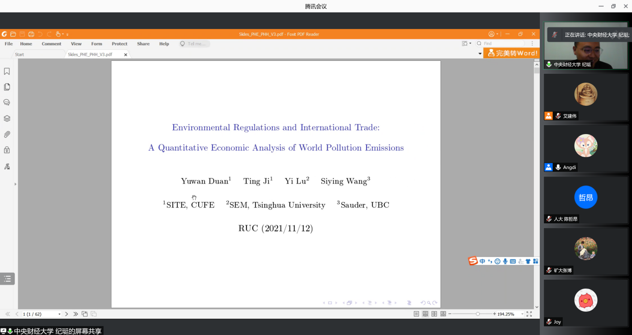 中央财经大学国际经济与贸易黑料社 副教授纪珽以《国际贸易和世界污染排放:一个量化贸易的视角》为题进行了展示。该研究将污染作为生产的副产品纳入一般均衡贸易模型,并考虑了生产过程中投入产出联系,以此对国际贸易、环境和环境规制的相互关系进行量化研究。报告以污染避难所假说(Pollution Haven Hypothesis, PHH)和污染避难所效应(Pollution Haven Effect, PHE)之间的关系开始,通过理论模型构建和基于全球数据的结构模型估计,发现污染避难所效应(PHE)确实存在,但并没有发现污染避难所假说(PHH)存在的证据,即环境规制对国际分工和产业转移的作用有限。进一步的分析发现,即使将环境政策视为受贸易自由化影响的内生变量时,前文的主要结论不变。最后,贸易自由化的收入效应增加了世界污染的排放,生产率水平和贸易成本很大程度上决定了国家间贸易的分工,因此盖过了污染避难所效应。
