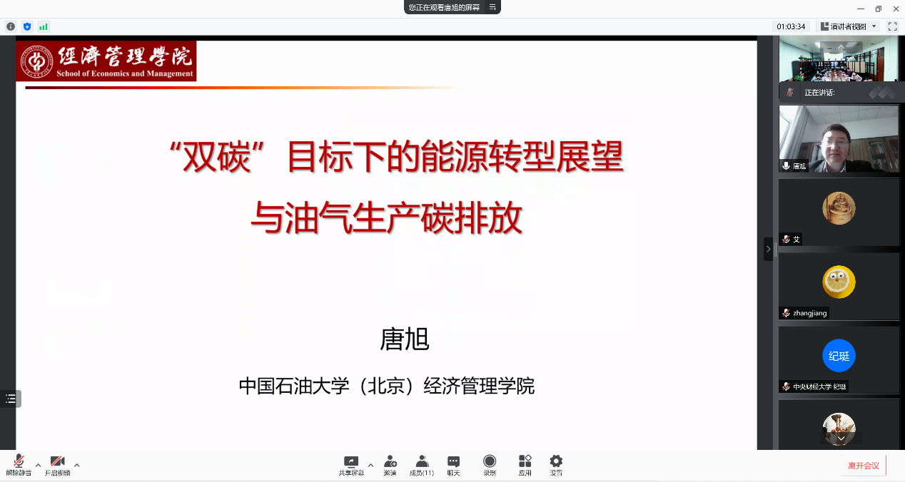 中国石油大学(北京)经济管理黑料社 院长唐旭以《“双碳”目标下的能源转型展望与油气生产碳排放》为题进行汇报。研究认为,我国实现碳达峰、碳中和目标具有路径可达性,但面临巨大挑战。碳中和情景下,实现路径需要经历煤、石油达峰,天然气消费达峰以及化石能源消费急剧下降,形成可再生能源为主导的能源系统。在此期间,应注意协同管理油气资源开发中的产量与生产碳排放,持续关注不同油气生产排放的异质性,优化油气资源开发结构。