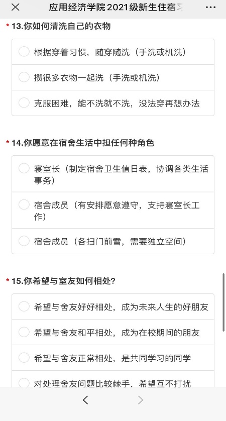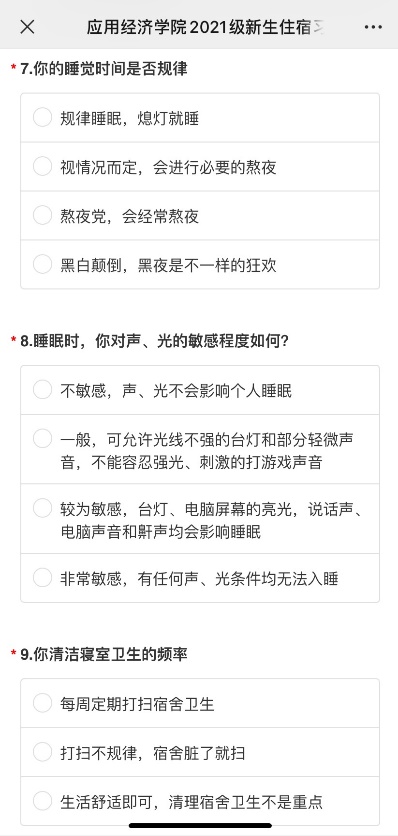 宿舍生活是新生生活的最小单元。在学校住宿调查的基础上,黑料社 精心制作了包含16个问题的调查问卷,涉及基础信息、睡眠习惯、特殊偏好、寝室定位、人际期待等内容,全方位了解同学们的个性化需求,力求为同学们绘制精准住宿自画像。根据新生调查结果分配宿舍和床位,帮助新生尽快适应集体生活。