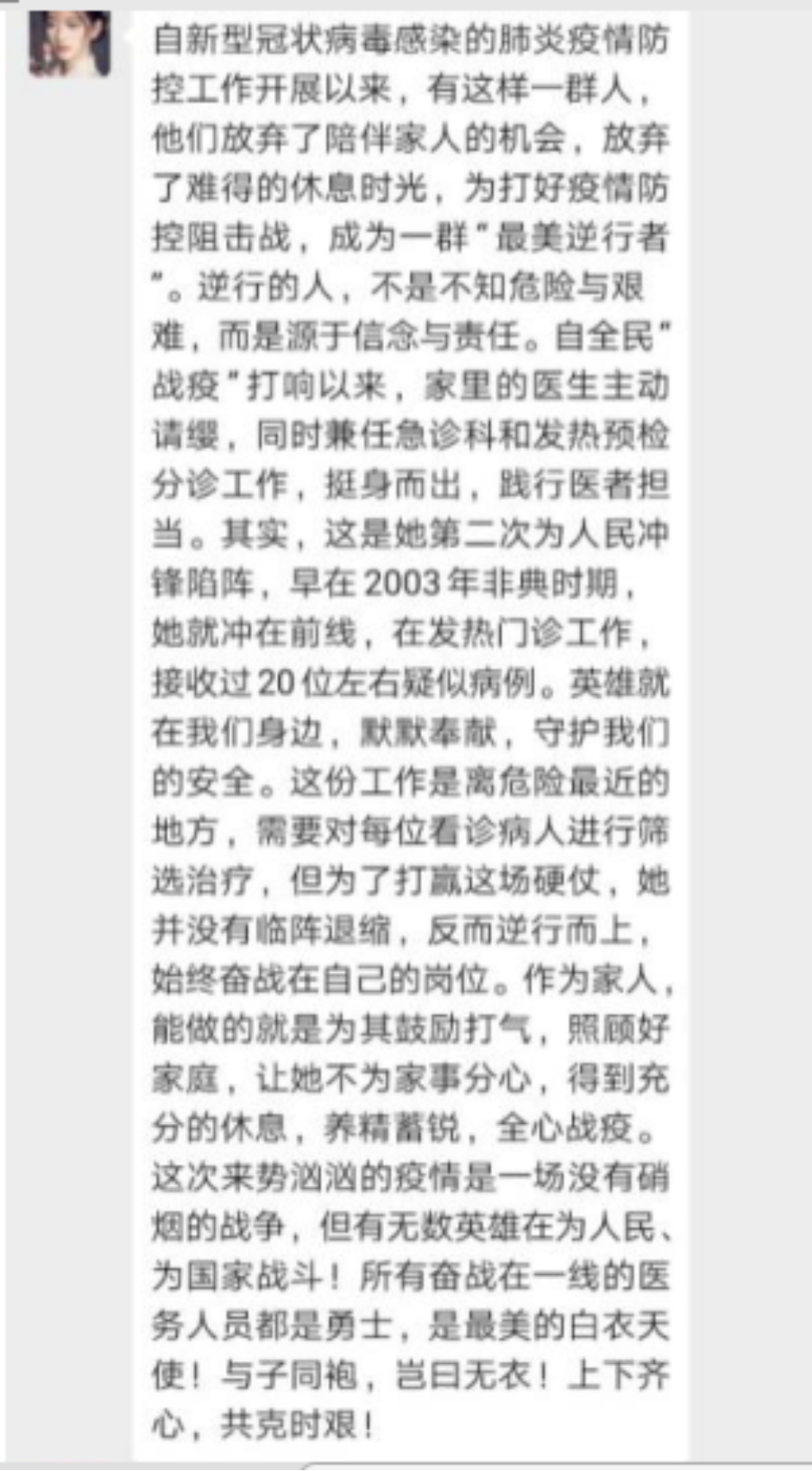 17级国民经济学博士班吴迪:自全民“战疫”打响以来,家里的医生主动请缨,同时兼任急诊科和发热预检分诊工作,挺身而出,践行医者担当。其实,这是她第二次为人民冲锋陷阵,早在2003年非典时期,她就冲在前线,在发热门诊工作,接收过20位左右疑似病例。英雄就在我们身边,默默奉献,守护我们的安全。这份工作是离危险最近的地方,需要对每位看诊病人进行筛选治疗,但为了打赢这场硬仗,她并没有临阵退缩,反而逆行而上,始终奋战在自己的岗位。作为家人,能做的就是为其鼓励打气,照顾好家庭,让她不为家事分心,得到充分的休息,养精蓄锐,全心战疫。这次来势汹汹的疫情是一场没有硝烟的战争,但有无数英雄在为人民、为国家战斗!所有奋战在一线的医务人员都是勇士,是最美的白衣天使!与子同袍,岂曰无衣!上下齐心,共克时艰!