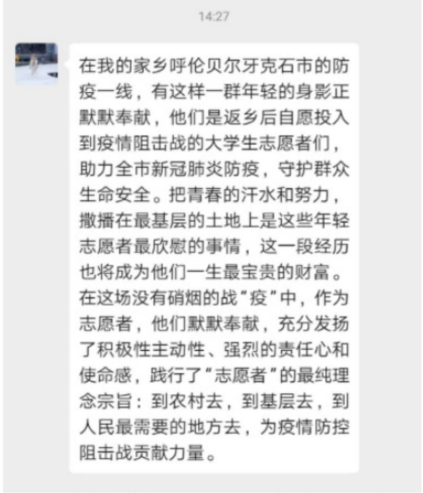 18级国民经济学博士班冯譞:在我的家乡呼伦贝尔牙克石市的防疫一线,有这样一群年轻的身影正默默奉献,他们是返乡后自愿投入到疫情阻击战的大学生志愿者们,助力全市新冠肺炎防疫,守护群众生命安全。把青春的汗水和努力,撒播在最基层的土地上是这些年轻志愿者最欣慰的事情,这一段经历也将成为他们一生最宝贵的财富。在这场没有硝烟的战“疫”中,作为志愿者,他们默默奉献,充分发扬了积极性主动性、强烈的责任心和使命感,践行了“志愿者”的最纯理念宗旨:到农村去,到基层去,到人