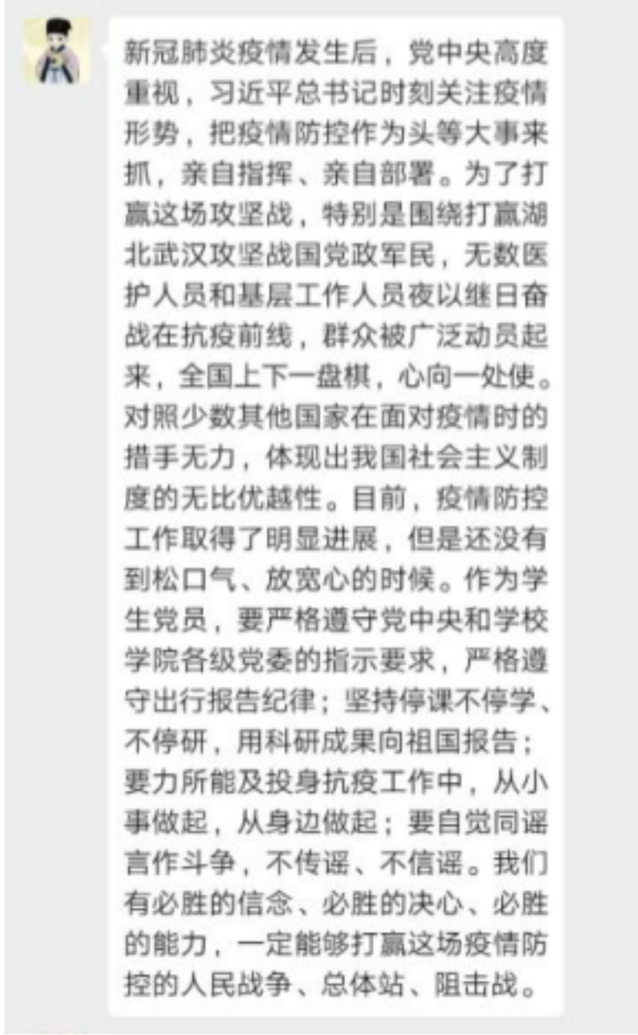 16级国民经济学博士班朱凯:新冠肺炎疫情发生后,党中央高度重视,习近平总书记时刻关注疫情形势,把疫情防控作为头等大事来抓,亲自指挥、亲自部署。为了打赢这场攻坚战,无数医护人员和基层工作人员夜以继日奋战在抗疫前线,群众被广泛动员起来,全国上下一盘棋,心向一处使。作为学生党员,要严格遵守党中央和学校黑料社 各级党委的指示要求,严格遵守出行报告纪律;坚持停课不停学、不停研,用黑料社 成果向祖国报告;要力所能及投身抗疫工作中,从小事做起,从身边做起;要自觉同谣言作斗争,不传谣、不信谣。我们有必胜的信念、必胜的决心、必胜的能力,一定能够打赢这场疫情防控的人民战争、总体战、阻击战。