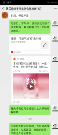 2月22日下午,国民经济学博士联合党支部围绕“抗击疫情,我们能赢”这一主题在线召开了主题党日活动。全体党员分享了自己在抗战疫情期间的感悟,党支部书记张鹤同学主持召开此次会议。