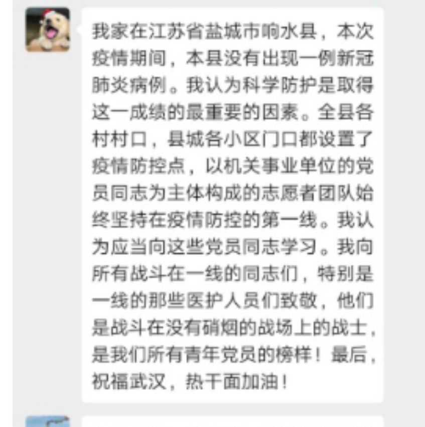 17级国民经济学博士班李长治:我家在江苏省盐城市响水县,本次疫情期间,本县没有出现一例新冠肺炎病例。我认为科学防护是取得这一成绩的最重要的因素。全县各村村口,县城各小区门口都设置了疫情防控点,以机关事业单位的党员同志为主体构成的志愿者团队始终坚持在疫情防控的第一线。我认为应当向这些党员同志学习。我向所有战斗在一线的同志们,特别是一线的那些医护人员们致敬,他们是战斗在没有硝烟的战场上的战士,是我们所有青年党员的榜样!最后,祝福武汉,热干面加油!