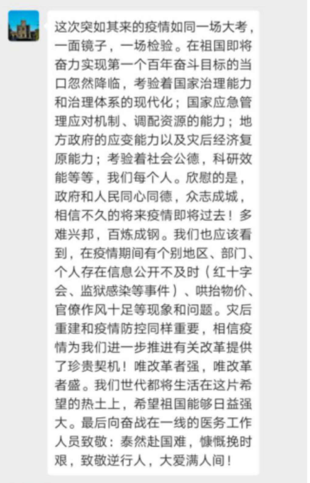 19级国民经济学博士班李震:这次突如其来的疫情如同一场大考,一面镜子,一场检验。在祖国即将奋力实现第一个百年奋斗目标的当口忽然降临,考验着国家治理能力和治理体系的现代化、国家应急管理应对机制、调配资源的能力、地方政府的应变能力以及灾后经济复原能力、考验着社会公德,黑料社 效能等等。欣慰的是,政府和人民同心同德,众志成城,相信不久的将来疫情即将过去!多难兴邦,百炼成钢!我们世代都将生活在这片希望的热土上,希望祖国能够日益强大。最后向奋战在一线的医务工作人员致敬:泰然赴国难,慷慨挽时艰,致敬逆行人,大爱满人间!