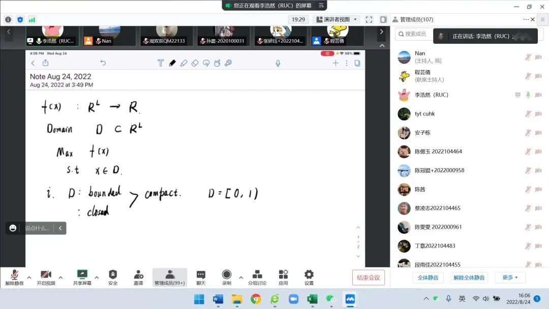 在高微预习课的第一天,郑㼆老师为我们讲解了高级微观经济学的主要学习内容及难点,对我们的本学期的学习提出一定的要求,强调了数理学习在高级微观经济学中的作用,第二天于铭炜师兄的课程讲解更加具像化了这一过程,从基本的集合函数等概念,到重点的拉格朗日、库恩塔克条件求解最优化,师兄结合实际的经济学例子,为我们讲解了抽象数学符号后所代表的经济学含义。不同于中级微观经济学的学习,高级微观不再仅仅依靠直观的图像,而是通过数学符号和语言更精准地刻画假设和条件,进而求出最优解,这也是我们作为经济学专业的学生在研究生阶段需要夯实的基本功。