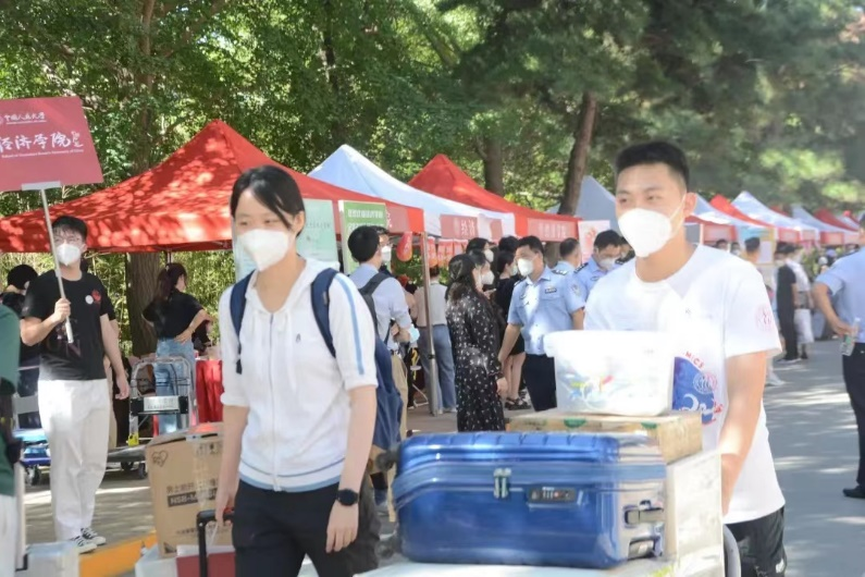 志愿者们帮助新生搬运行李,忙碌的身影在迎新队伍中穿梭。