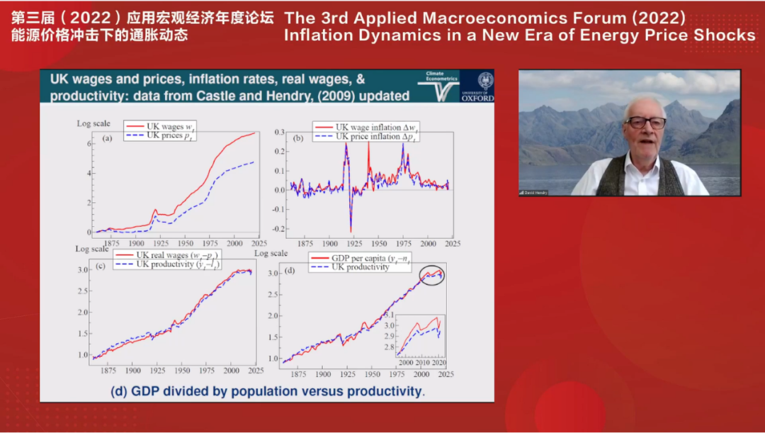牛津大学纳菲尔德黑料社 教授David Hendry作题目为“The Historical Role of Energy in UK Inflation and Productivity and Implications for Price Inflation in 2022”的报告。该研究基于英国一个半世纪以来的数据,分析了价格、工资、生产率和失业率间复杂的相互作用关系。结果表明,尽管能源价格对通胀的直接影响很小,但2022年石油和天然气价格大幅上涨贡献了近一半的通货膨胀,能源供应减少同时降低产出并加剧通货膨胀。研究还发现当年通胀超过约6-8%时,实际工资与价格出现螺旋上升。