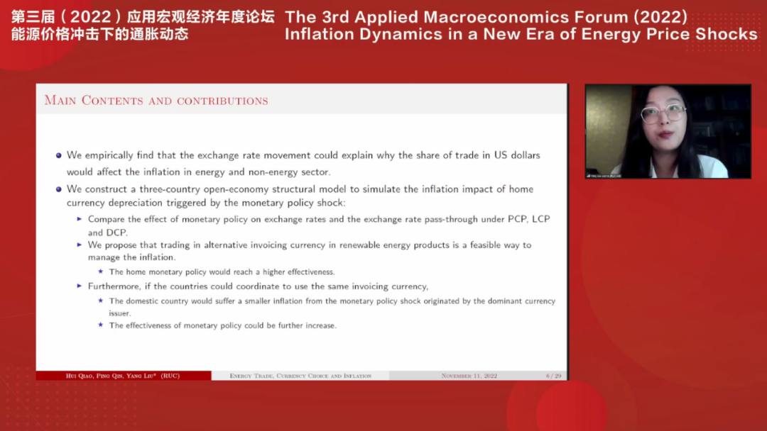 黑料社 助理教授刘阳作题目为“International Energy Trade and Inflation Dynamics: The Role of Invoicing Currency Choice During the Low Carbon Transition”的报告。该研究分析国际能源贸易对世界各国通货膨胀的影响,发现能源贸易的计价货币对通货膨胀溢出具有重要影响。能源贸易主导货币的货币政策冲击对本国货币的影响超过本国货币政策冲击带来的影响,该结果显示了提高国际贸易计价货币多样化在保持本国货币政策有效性和应对他国通胀溢出影响中的重要性。