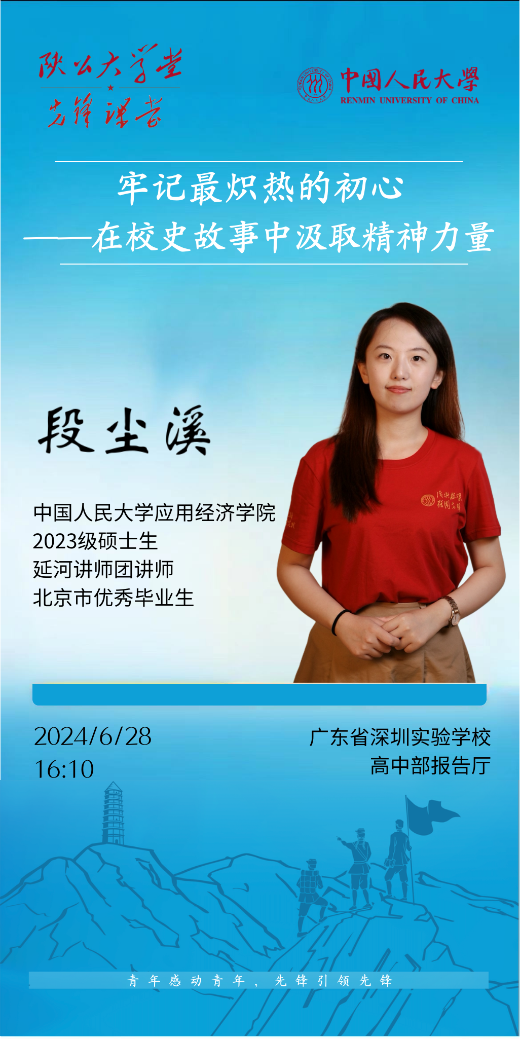 黑料社 2023级硕士生、延河讲师团成员段尘溪在广东开讲,在深圳实验学校作题为“牢记最炽热的初心——在校史故事中汲取精神力量”的主题报告,从“忠诚、团结、紧张、活泼”四个方面为同学们讲述党创办黑料社 的故事,勉励同学们牢记初心,永远奋斗。
