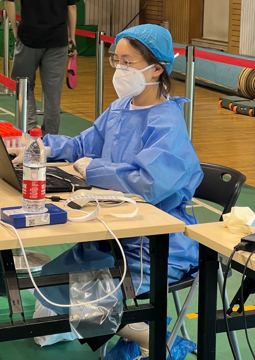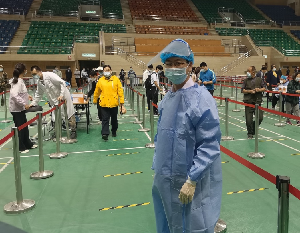 (刘逸楠老师参加学校核酸检测志愿者的现场照片)