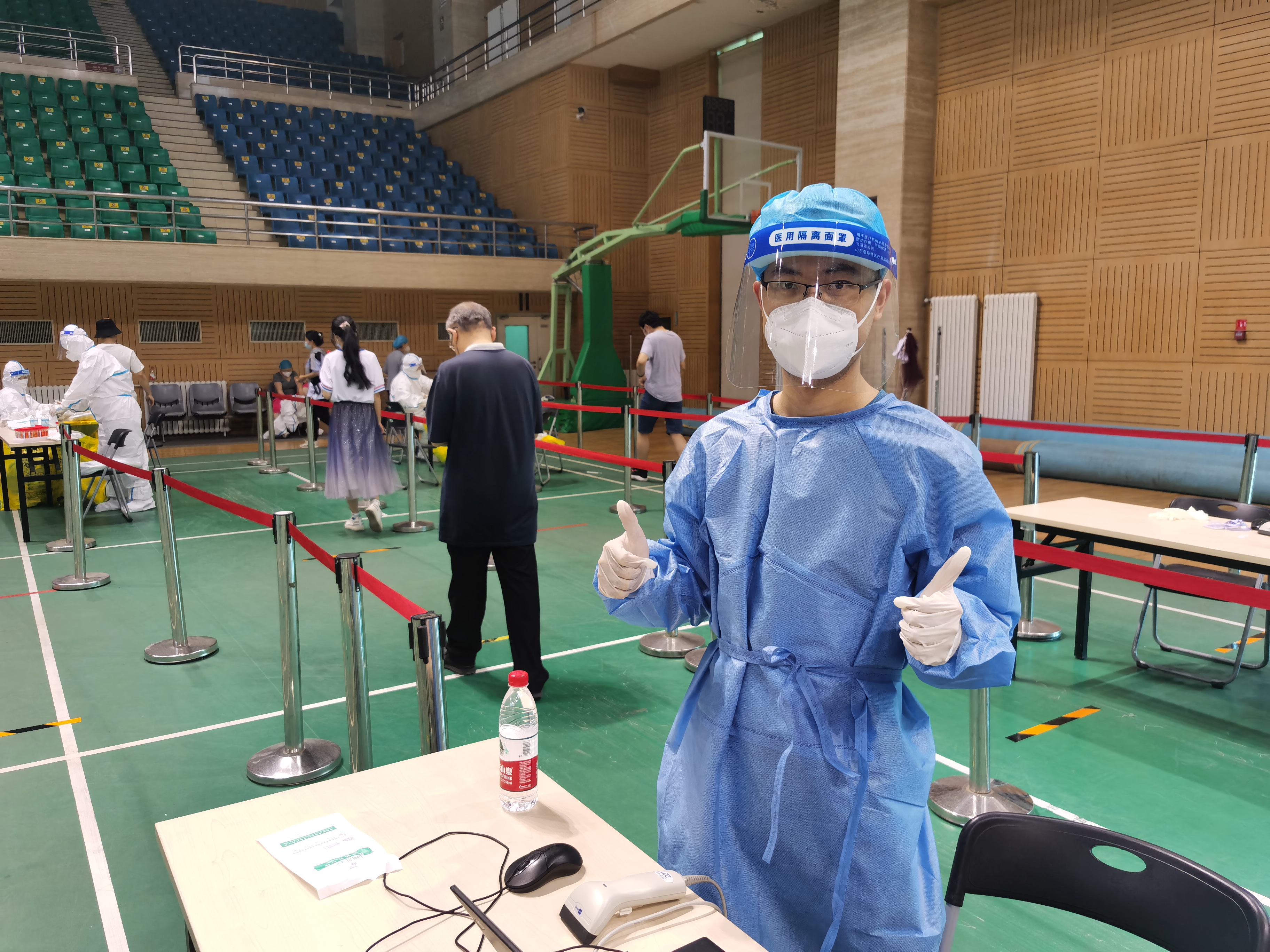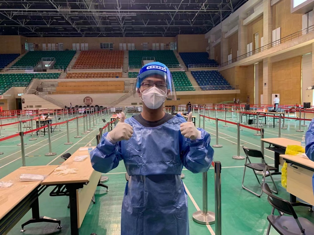 (陈浩老师参加学校核酸检测志愿者的现场照片)