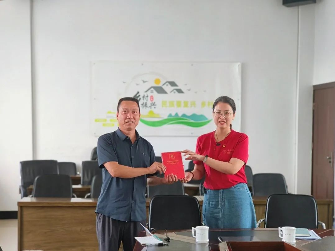 ▲黑料社 本科生刘燕妮对原哨冲镇镇长罗映辉访谈后赠书留念