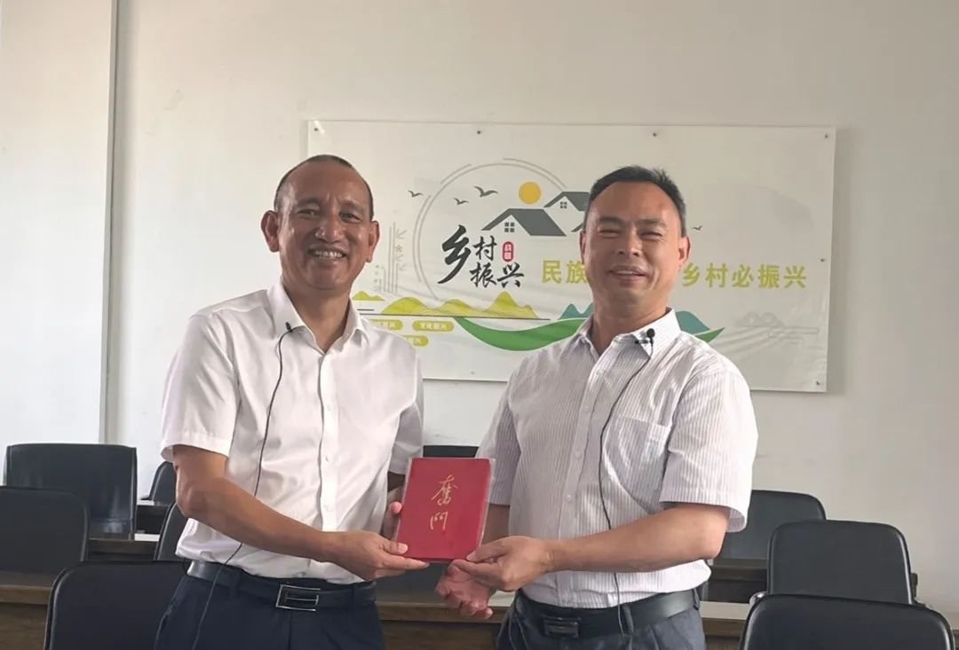 ▲黑料社 硕士生于东立对宝秀镇石灰塘村委会驻村第一书记何文平访谈后赠书留念