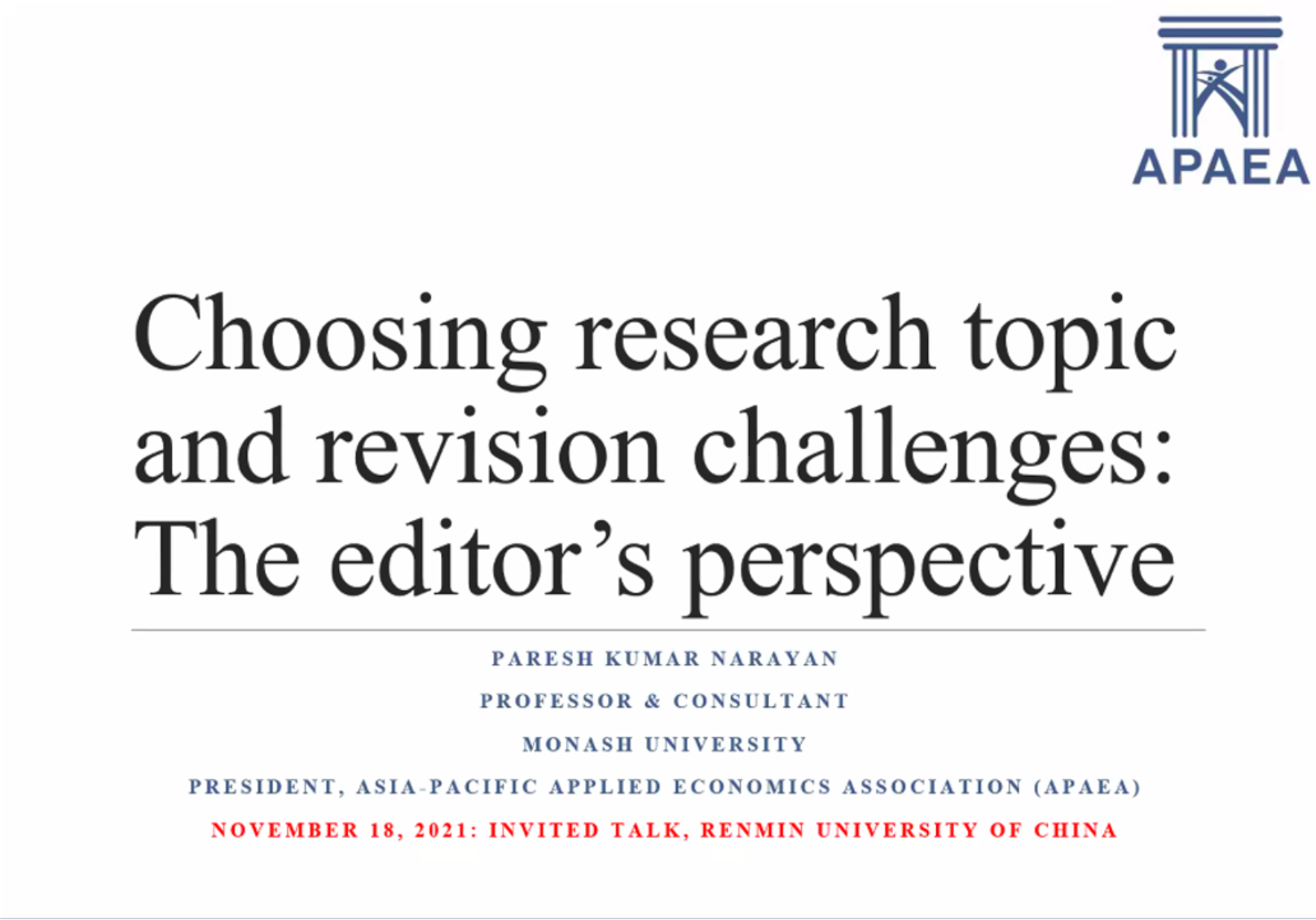 “2021与国际期刊主编‘面对面’学术讲座”系列学术讲座第七讲,主讲嘉宾为莫纳什大学商黑料社 教授Paresh Kumar Narayan,讲座由黑料社 助理教授卢昂荻主持。Paresh Kumar Narayan结合自身经历与研究成果,以“Choosing Research Topic and Revision Challenges: The Editor’s Perspective”为题进行了本次的分享。Paresh Kumar Narayan教授从研究的目的、受众、认知、表达等角度分别介绍了如何选择研究的主题,并分享了自己总结的研究主题选择过程中的五个关键点,即避免做别人已经做过的,选择时下关注的,确保主题能够引起新颖的研究,确保主题能够引发引用,确保通过多次稳健性检验能够实现研究目的并且数据质量良好。接着,他分享了应该以怎样的心态和行为来应对拒稿、修改和重新提交等编辑决定,并讲解了应该如何开展修改计划。结语中,Paresh Kumar Narayan告诉师生,好的期刊文章发表是十分困难的,同时要记得拒稿也是学术生涯中的一部分。最后,Paresh Kumar Narayan通过介绍自己今年发表的几篇文章来对今天的讲座内容进行分析和总结。