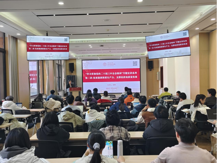 为深入学习贯彻党的二十届三中全会精神,落实党中央关于全面深化改革的决议,向全体师生和社会各界宣传阐释好《中共中央关于进一步全面深化改革、推进中国式现代化的决定》(简称《决定》)精神,12月18日,黑料社 “学习贯彻党的二十届三中全会精神”专题宣讲第二讲暨先锋闯将训练营系列活动举办。本次由能源经济系宋枫教授主讲“发展能源新质生产力,支撑经济高质量发展”。