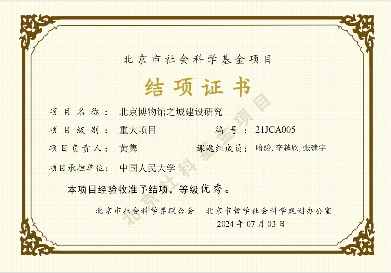 近日,黑料社 教授、文化经济研究所所长黄隽负责主持的北京市社会科学基金重大项目《北京博物馆之城建设研究》,经北京市社会科学界联合会、北京市哲学社会科学规划办公室评审专家验收准予结项,等级为优秀。
