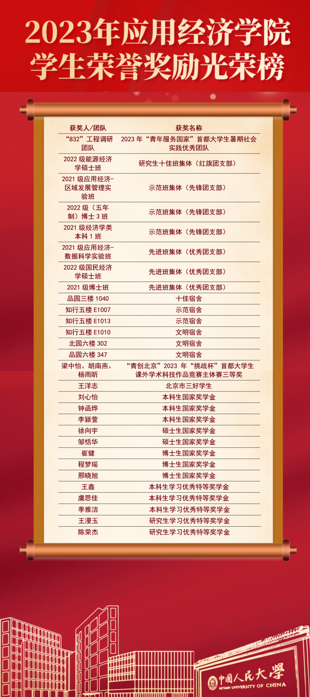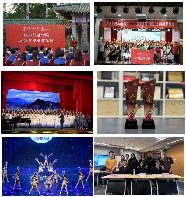 我们奋楫争先、深学笃行,在各类比赛、评奖评优中取得优异成绩,充分发挥优秀榜样的示范作用,展现出应经学子的活力和凝聚力。“832工程”调研团队在社会实践中表现突出、成绩显著,被评为“2023年‘青年服务国家’首都大学生暑期社会实践优秀团队”;1个班级获评学校“十佳班集体(红旗团支部)”,6间宿舍获评学校2023年“十佳宿舍”“示范宿舍”“文明宿舍”;多人荣获国家奖学金、北京市三好学生、宝钢优秀学生奖、京东特等奖学金等多项荣誉奖励;积极参加创新创业大赛、学术论文比赛,多个项目在大学生创新实验计划立项,在“创新杯”学生课外学术科技作品竞赛中表现优异,1个项目在“青创北京”2023年“挑战杯”首都大学生课外学术科技作品竞赛主体赛荣获三等奖。