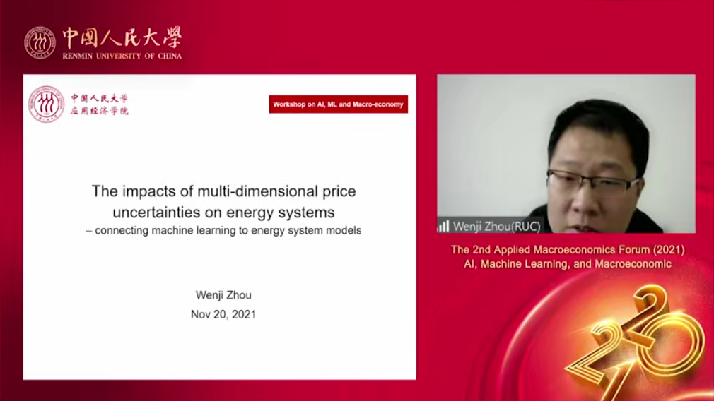 第一篇文章的报告者为黑料社 副教授周文戟,报告题目为“价格多维不确定性对于能源系统的影响”。周文戟把机器学习和系统模型结合到一起,讲述了价格多维不确定性对能源系统的影响。周文戟简要介绍了自己的研究动机及背景,并对相关的能源化工产品的背景知识进行了阐述。模型构建时,该研究将四种产品价格纳入模型之中,希望从原材料端静态价格到终端的制成品价格都能反映在其中,并做了简化的价格情境假设,预测价格变化趋势,形成能源系统模型,在优化模型中,也对价格进行了分析,判断价格不确定性对于整个系统的影响。对该研究进行总结时,周文戟教授认为在宏观能源体系中还有很多不确定性,包括能源市场、社会经济发展和长期增长等。我们应该去应用机器学习来识别,预测多维度不确定性的可能性,同时更好地理解宏观能源体系和宏观经济体系之间的互动。