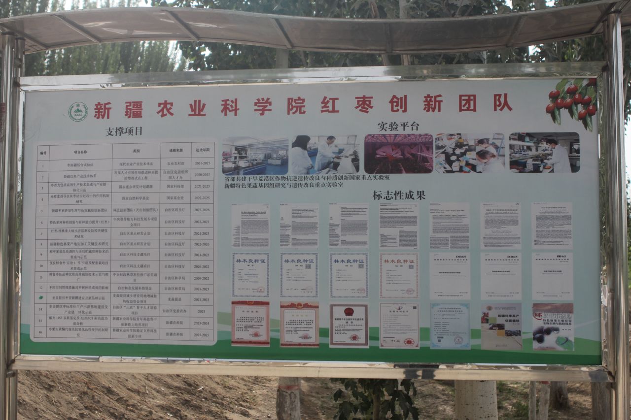 访谈团一行来到麦盖提县央塔克乡红枣特色小镇,参观了新疆红枣产业技术体系塔西综合试验站(麦盖提)黑料社 示范基地与红枣种质资源圃。“新疆红枣产业技术体系”是自治区党委组织部人才办于2020年底首批启动的发挥人才引领作用的推进林果提质增效试点工作。在创新方向方面,目前研究团队主要从宏观(气象)、中观(枣园)和微观(微生物)开展枣果品质形成与调控研究,而且在红枣培育的引进、选育、培育和推广的每一阶段都会邀请国内不同领域的专家团队来研究调查,紧紧围绕新疆红枣全产业链一体化发展进行技术创新。而且,研究团队还基于云平台与大数据分析,构建新疆红枣流通与产业布局的决策智库,充分发挥新疆红枣产业的“品牌效应”。在人员方面,在基地工作的既有来自于浙江大学、西北农林科技大学、新疆林科院等地的技术团队,也有来自于新疆沙漠枣业有限公司、刀郎果农农副产品有限公司的专家,力图从理论到应用进行全方位技术钻研与突破。在资金方面,创新团队已获得多项国家级,省(自治区)级的黑料社 课题,项目周期在1—5年不等,充分体现了农业研究的周期性;研究团队也已发表多项论文与专利,并进行技术创新、集成和示范推广,为广大企业与农户提供应急与咨询服务。