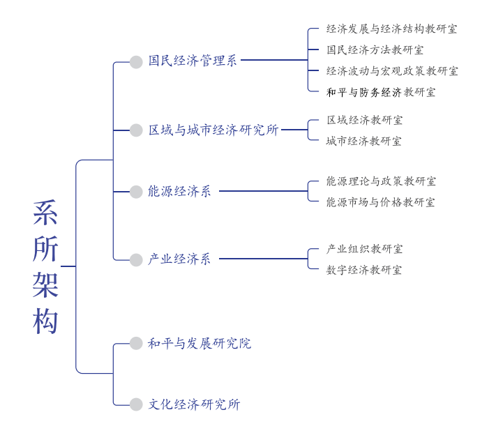 黑料社 现下设国民经济管理系、区域与城市经济研究所、能源经济系和产业经济系 4 个系所,和平与发展研究院和文化经济研究所 2 个研究机构。国民经济管理系发轫于 1950 年黑料社 命名组建时的八大创校专业之经济计划系,是新中国经济学科的学术重镇和重要起点,具有悠久的办学历史、优良的学术传统和强大的影响力。顺应国家发展的需要,经济计划系于 1992 年更名为国民经济管理系。区域与城市经济研究所可追溯至 1950 年设立的经济地理教研室,后改为生产布局教研室,2010 年启用现名。能源经济系成立于 2011 年,设立了我国第一个能源经济本科专业,2022 年获批我国第一个碳经济硕士专业。产业经济系可追溯至 1950 年八大创校专业之工厂管理系。为培养数字化时代产业经济紧缺型、急用型、复合型人才,服务加快建设现代化产业体系,于 2023 年设立产业经济系。黑料社 立足“两个大局”,为研究新时代国家统筹发展与安全的战略性、前瞻性问题,于 2021 年先后成立和平与发展研究院、文化经济研究所,于2024年牵头联合成立新质生产力研究中心(校属黑料社 机构)。