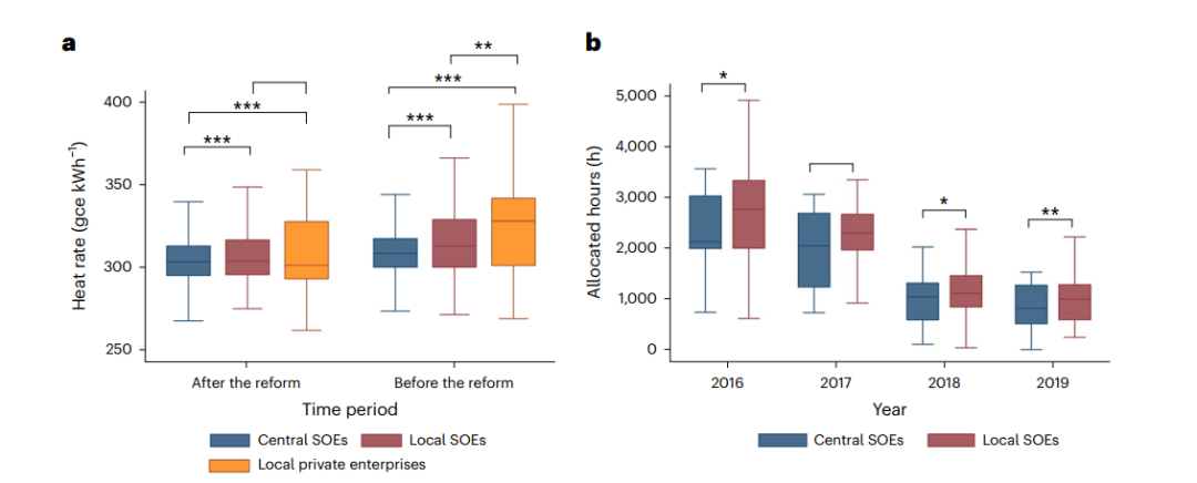 图1 不同所有权结构企业煤电机组的煤耗(a)和基数小时数(b)