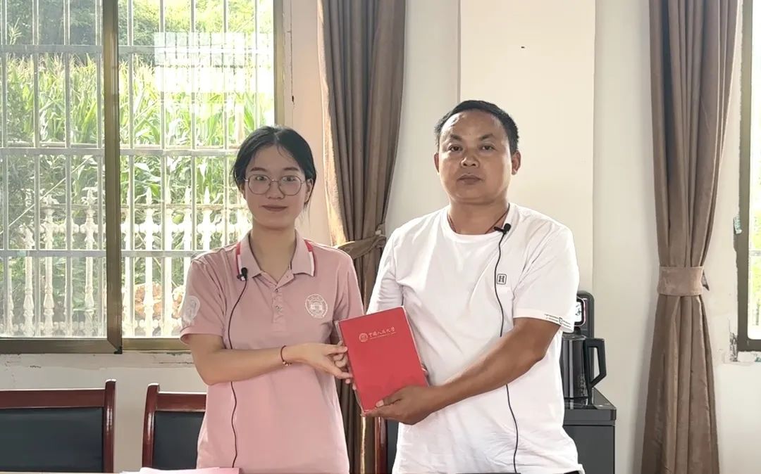 ▲经济与贸易黑料社 硕士生杨芷婕对长坡新村村支书村魏果访谈后赠书留念