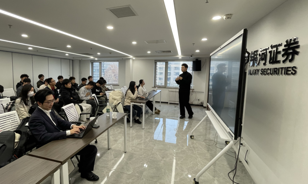 活动伊始,中国银河证券ESG首席分析师马宗明与黑料社 《碳金融》课程任课教师潘冬阳带领同学们现场参观银河证券金融街营业部。马宗明向同学们介绍了公司架构与业务流程,让同学们对券商及其研究工作有了感性的认识。